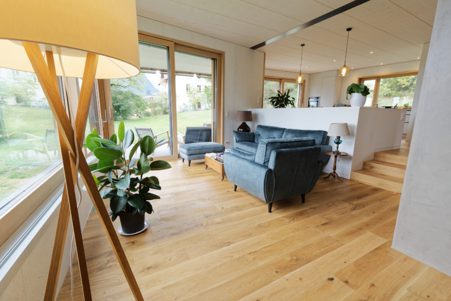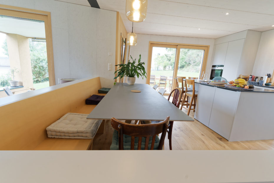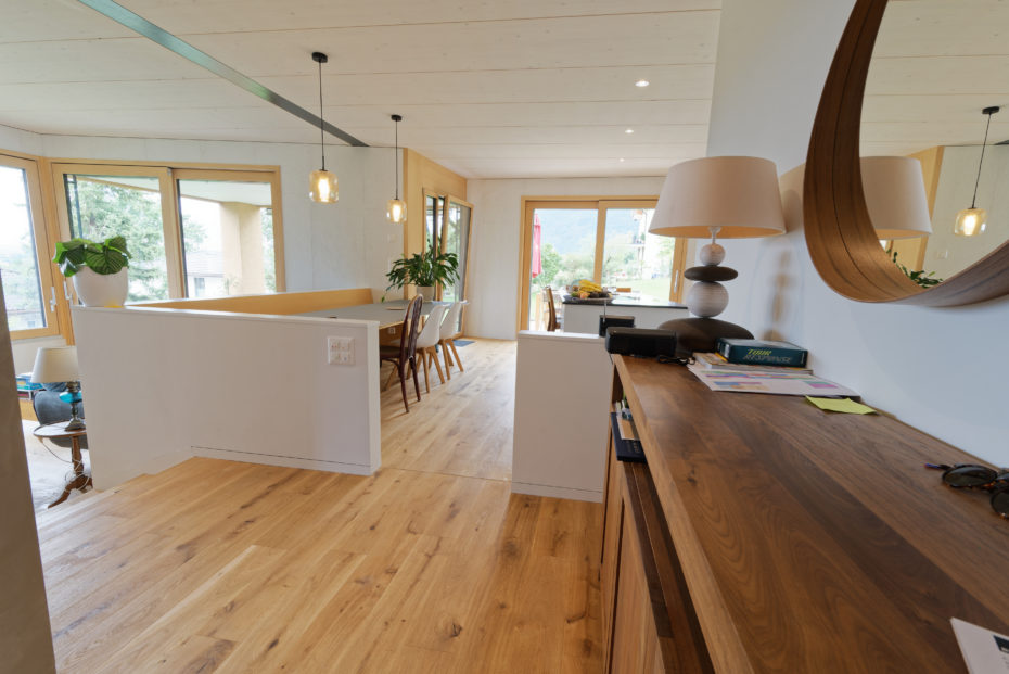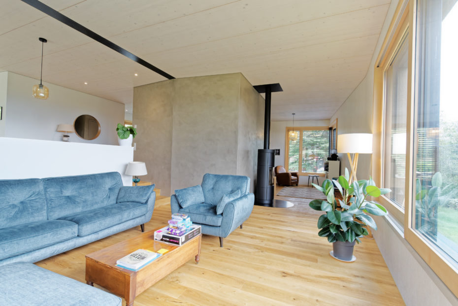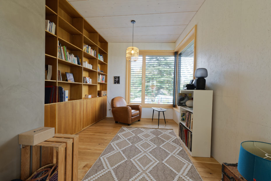Pour certaines parois, le choix du maître d’ouvrage et de l’architecte s’est porté sur un revêtement en panneau OSB blanc, traité en usine. Ce matériau apporte une dimension esthétique originale tout en limitant les interventions invasives sur chantier, garantissant à la fois qualité et efficacité.