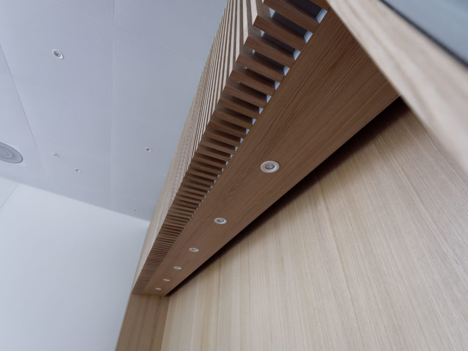 Ce genre de parois recouvert de petites lattes, préparées une à une dans les ateliers, permet de suivre n’importe quel arrondi. La finition parfaitement alignée avec le sol et le plafond est très esthétique. Les propriétés acoustiques de cet habillage sont impressionnantes et confèrent aux vastes espaces une atmosphère agréable.